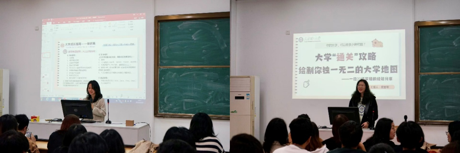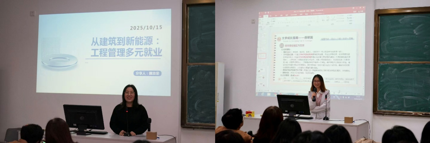 随后,往届优秀校友代表结合工作实践作务实性汇报,分享在工程项目管理、成本控制等岗位的实战经验。并针对职业规划、行业准入标准等新生关切问题给出具体建议,帮助新生建立职业认知。紧接着,2022 级推免学生代表结合大学四年经历,从课程学习、科研培养、竞赛策略、保研规划等方面分享经验。