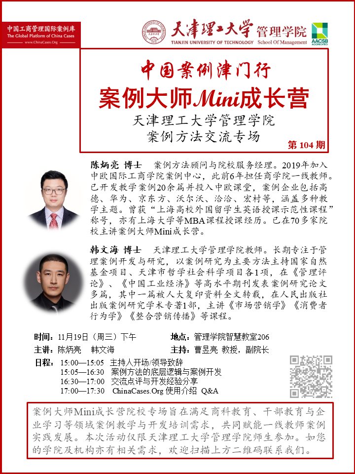 此次活动将重点围绕案例方法的底层逻辑和案例开发技巧展开深入研讨。期间将针对同一家企业,通过比较不同作者开发的案例版本,探讨高质量案例教学背后的设计逻辑与经验,同时介绍案例库使用技巧。我们诚挚邀请您莅临案例大师Mini成长营,共同探索案例教学的前沿趋势,携手推动教育事业的持续进步。