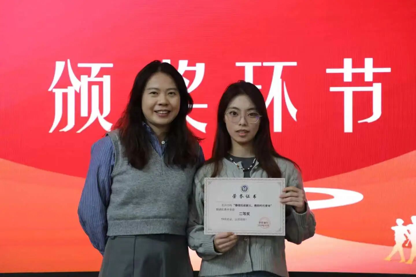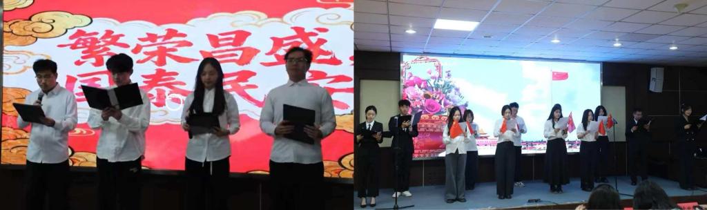 各参赛队围绕“烽火岁月”“改革春风”“强国新篇”“青春担当”四大主题进行了精彩展示:有的通过深情的朗诵回顾抗战时期的烽火岁月,有的结合视频与情景表演展现改革浪潮中人们奋斗的身影,有的则以铿锵有力的语调表达新时代青年的责任与担当……各队伍将文字与艺术相结合,或慷慨激昂,或温情舒缓,既表达了对历史的深切缅怀,也传达了对祖国的无限热爱和对未来的坚定信念,勉励全体师生以朗诵为媒介传递奋进动力,以初心为指引,勇敢承担时代使命。