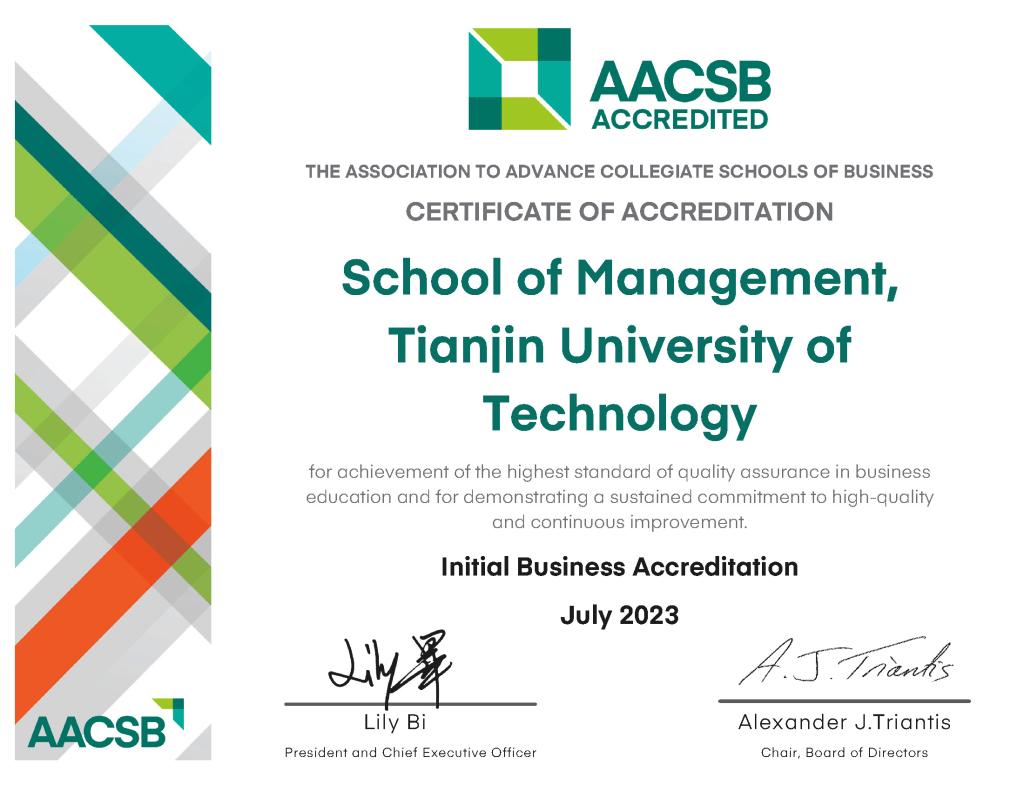 The School of Management became an official member of AACSB in 2015, obtained EA in 2017, and passed iSER report in 2019. In 2020, it successfully submitted the Substantive Change Report, followed by the first progress report (Update Report) in 2020 and the second progress report in 2021. The final SER report was submitted in 2022. In 2023, the School earned initial AACSB accreditation. This achievement marks the School as the 48th institution in Mainland China and the first at a municipal university in Tianjin to achieve this distinction, placing it among the top 6% of business schools worldwide.