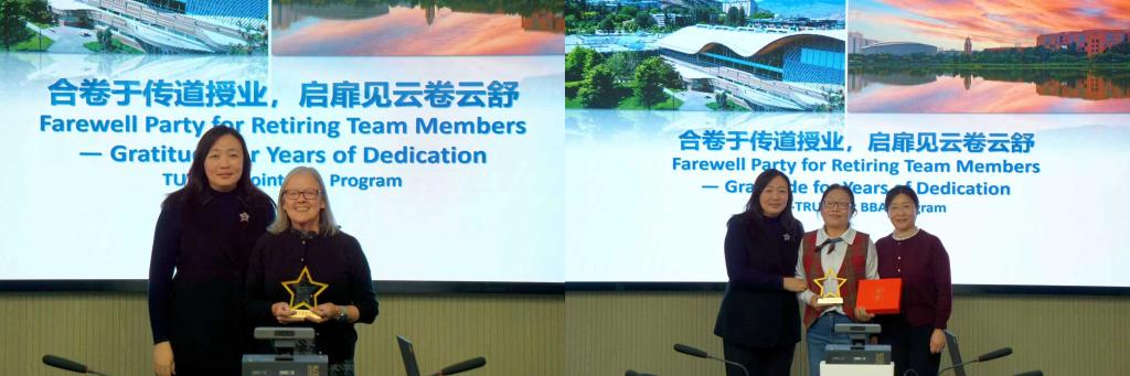 管理学院党委书记石娟在致辞中强调,中加合作办学项目在学院发展进程中占据重要地位,她向两位荣休教师致以诚挚谢意,感谢二人数十年来在教学协调管理与教学运行保障工作中作出的突出贡献。随后,项目负责人张明老师结合共事经历,高度赞扬两位教师在中加合作办学项目建设与发展中的关键作用。她特别致谢加方代表 Lisa Lake 女士 —— 多年来,Lisa Lake 女士积极为两校搭建实质性交流桥梁,始终以无私奉献的精神为师生发展提供鼎力支持,有力推动了项目的稳步前行。加方教师Lisa Lake女士动情回忆了与学院多年的合作情谊,并为项目的发展成就感到欣慰,并送上祝福。中方教师谭雪立女士回顾了教育生涯,感谢学院支持,并表示荣休后仍将心系学院,发挥余热。最后,学院领导共同为两位教师颁发了荣休纪念品,以感谢她们为合作项目的默默耕耘与无私奉献。