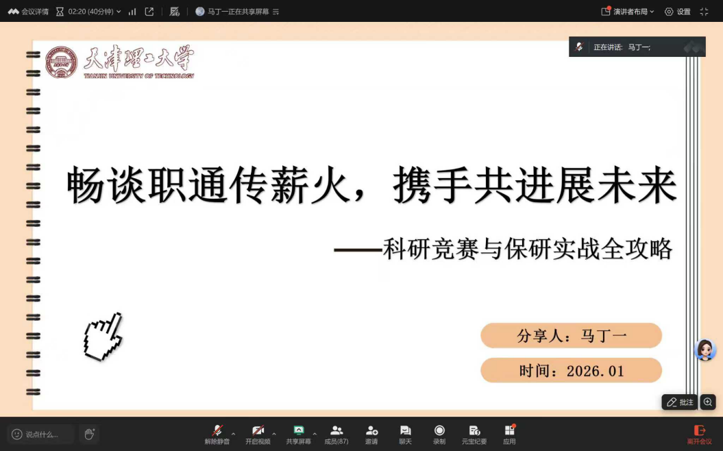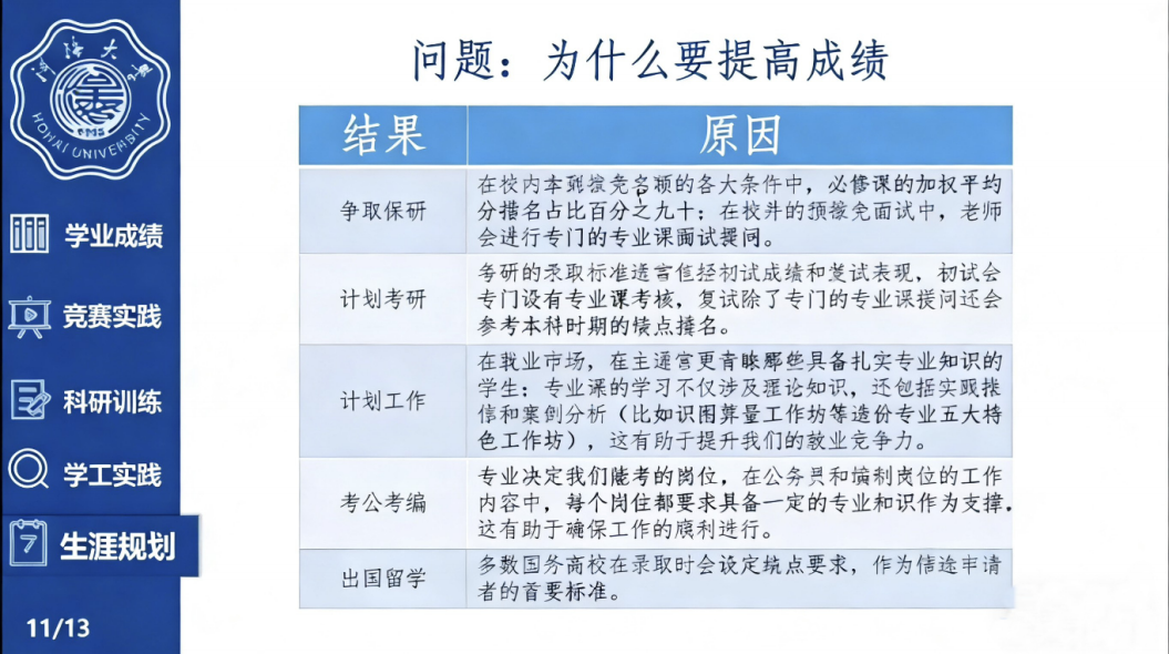 分享会上,朱昱文同学聚焦学业成长的核心逻辑,围绕“为什么要提高成绩”“怎样提高成绩”两大核心问题,细致梳理了大一至大三的分阶段学业规划:建议大一适应探索、夯实基础,快速融入大学学习节奏;大二深耕定向、聚焦专业,筑牢专业核心能力;大三冲刺决策、明确目标,精准发力成长方向。同时,他还强调,学业提升与全面发展并行不悖,鼓励同学们兼顾科研训练、学工实践与生涯规划,在五育融合中实现综合素养的全面提升。