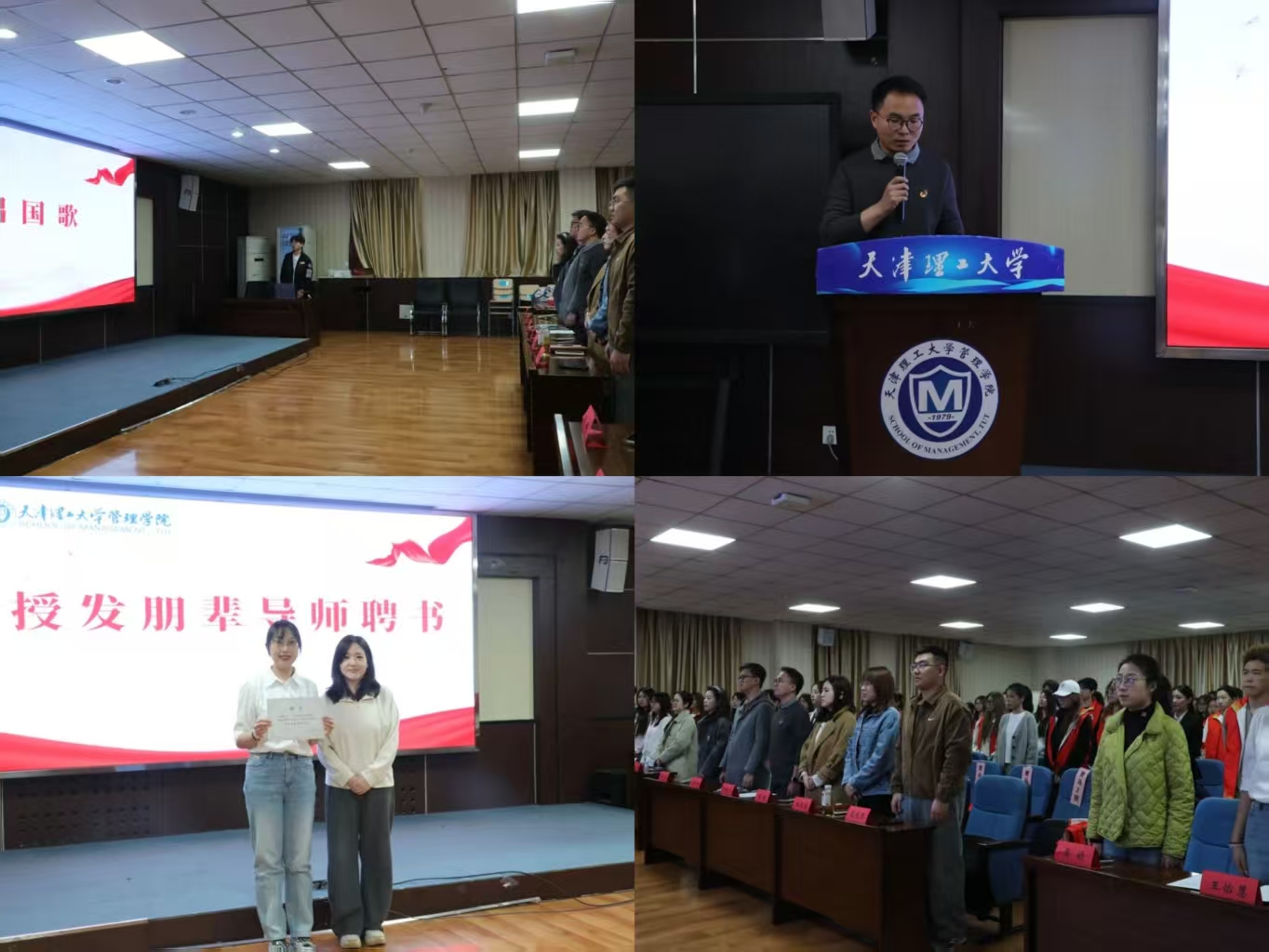 开班仪式在庄严雄壮的国歌声中拉开帷幕,全体人员肃立注目、齐唱国歌。随后,管理学院团委书记于世川宣读开班决定,学工办副主任张婷为朋辈导师颁发聘书。