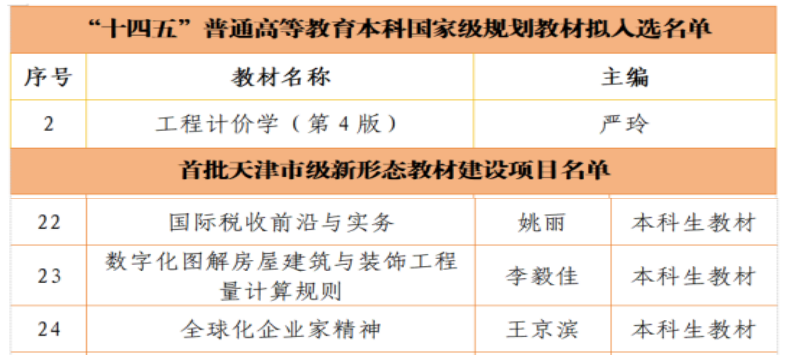 教材建设、课程建设方面亦取得显著成绩。我院严玲教授主编的《工程计价学(第4版)》成功入选教育部“十四五”普通高等教育本科国家级规划教材。在首批天津市级普通高校新形态教材建设项目立项中,学院共获批3项。