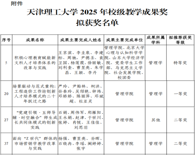 此外,2025年校级教学成果奖拟获奖名单近日已公示,管理学院教师荣获校级特等奖1项、一等奖1项、二等奖2项。