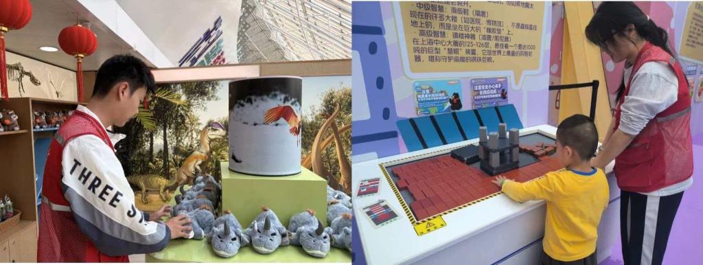 活动期间,志愿者们分工明确、各司其职,以饱满的热情投入工作。在科普探索中心的各个互动展区,志愿者们协助小朋友签到、课堂拍摄记录,到提前准备活动物料、维护活动现场秩序,每一个环节都细致到位、认真负责;在游乐设施旁,志愿者们悉心看护小朋友并引导他们安全游玩,主动提醒他们远离危险区域。此外,部分志愿者还积极协助文创产品销售、纪念品货架整理等工作。