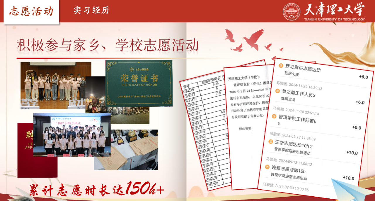我相信,真正的成长源于将所学回馈社会。在志愿服务中,我累计服务时长超150小时,足迹从校园延伸至家乡。2024年1月,在邮储银行实习期间,我负责为客户提供业务办理与理财咨询服务,这段经历让我将保险学理论知识转化为实际服务能力,更深刻体会到金融工作的民生价值。