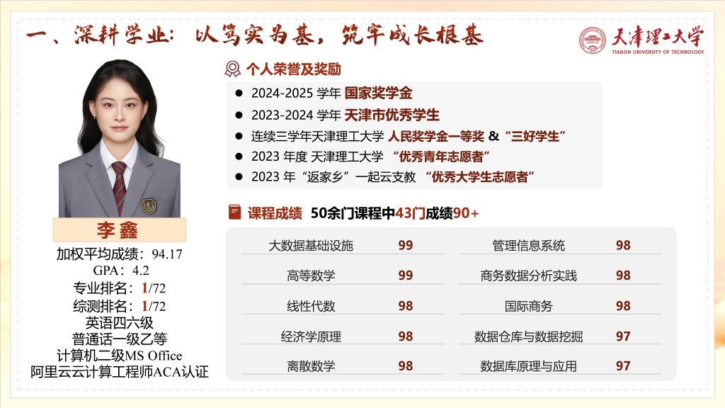 “学习是学生的立身之本”,这是我始终坚守的信念。本科期间,我学习态度严谨认真,刻苦钻研。已修读50余门课程中,43门取得90分以上的成绩,平均学分绩点4.2,连续三学年专业排名第一,已通过大学英语四六级,三次获得人民奖学金一等奖以及“三好学生”荣誉称号。同时,考取了普通话一级乙等、计算机二级MS Office、阿里云云计算工程ACA认证。