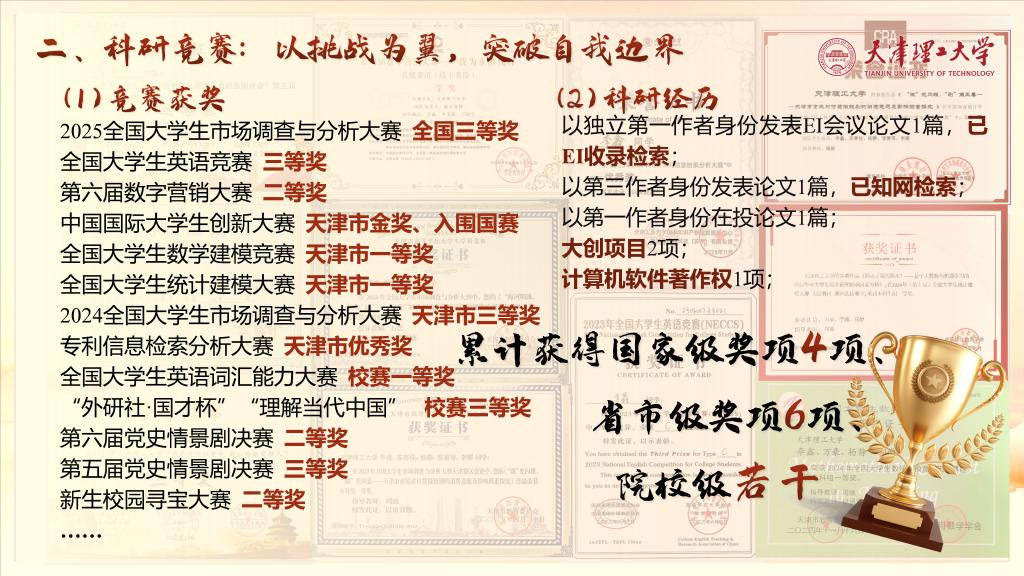 “不满足于书本知识,更要在实践中检验所学”,这是我对自己的更高要求。我专注于科技创新与竞赛实践,积极参与专业相关赛事和项目,不断挑战自我、提升能力。以独立第一作者身份发表EI会议论文1篇(已EI收录检索),以第三作者身份发表论文1篇(已知网检索),以第一作者身份在投论文1篇,同时参与2项大创项目。荣获全国大学生市场调查与分析大赛全国三等奖、全国大学生数学建模竞赛天津赛区一等奖、全国大学生统计建模大赛天津赛区一等奖等省市级以上奖项10项。