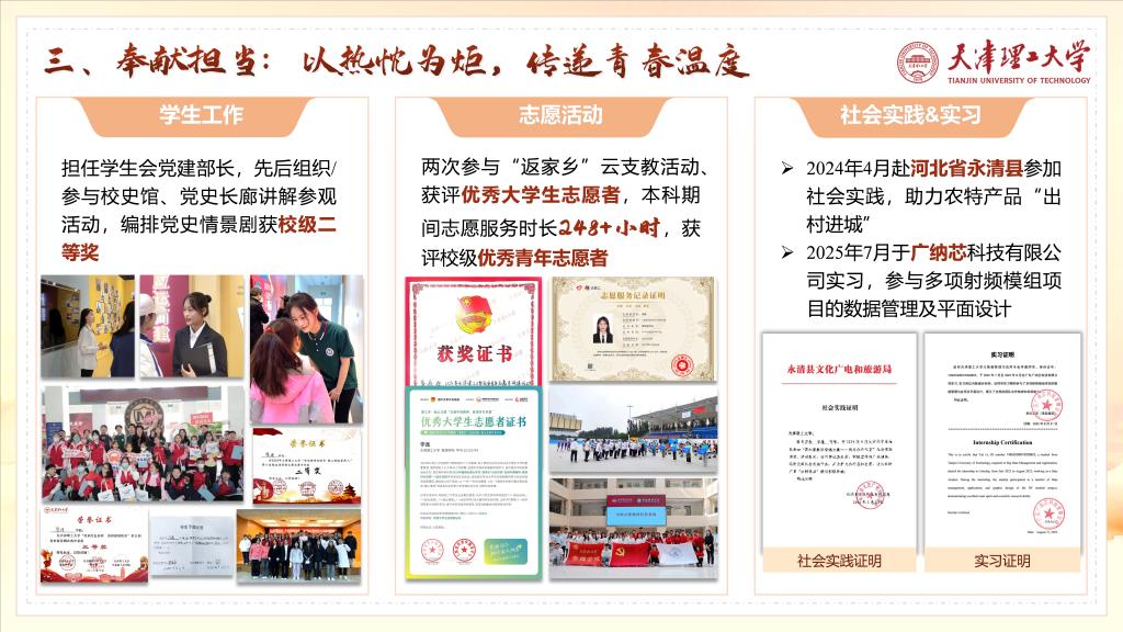 “青春不止于个人成长,更要学会回馈身边人与社会”,这是我一直践行的价值观。作为党建部长,我负责讲解队培训、考核,组织并参与校史馆、“百年风华”党史长廊的讲解工作;积极参与云支教、明理农场等各类志愿服务活动,累计志愿服务时长超248小时,荣获天津理工大学“优秀青年志愿者”和“一起云支教”优秀大学生志愿者荣誉称号。