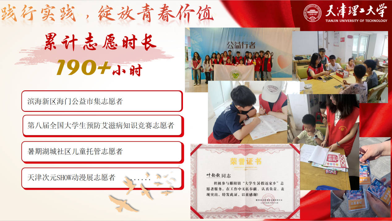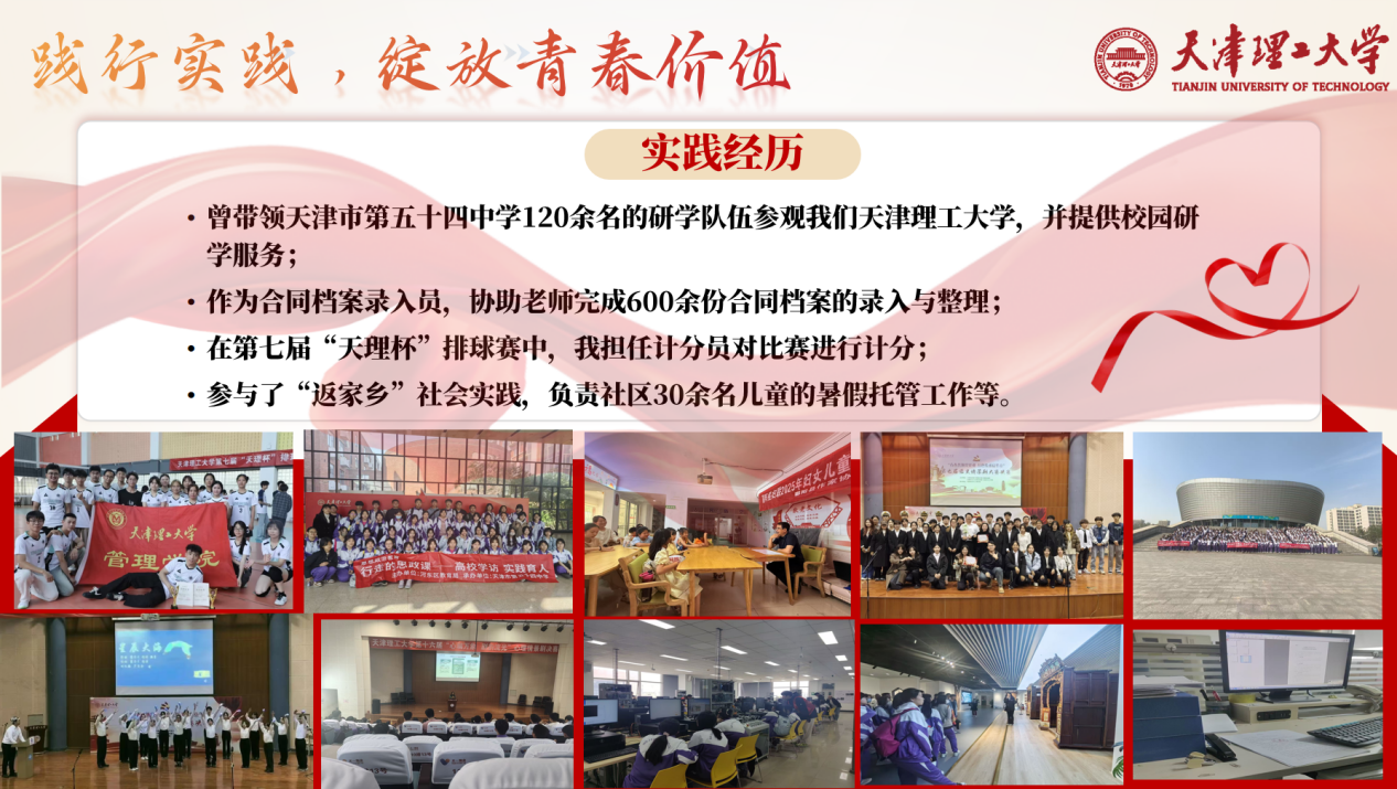 以“谦”为怀,以“恒”为帆。我始终坚信,成长需扎根实践、服务社会。我深知“知行合一”的意义,累计参与志愿服务超190小时。曾带领天津市第五十四中学120余名的研学队伍参观天津理工大学,并提供校园研学服务;作为合同档案录入员,协助老师完成600余份合同档案的录入与整理;在第七届“天理杯”排球赛中,我担任计分员;此外,我还参与了“返家乡”社会实践,负责社区30余名儿童的暑假托管工作。这些实践经历,让我在统筹协调、沟通协作和责任担当上都得到了极大的提升。