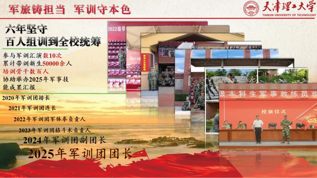 扎根国防教育和新生军训,从军训团排长成长为统筹全局的军训团团长,累计带训新生超5万人、培训骨干数百人,连续六年(2020-2025)获评“优秀教官”称号;带领团队获 2024、2025年天津市国旗护卫队决赛三等奖(教练员),与天津市大学软件学院共建军事训练营并协助举办2025年军事技能成果汇报,多次受天津市南开区人民武装部借调参与比武获优异成绩。