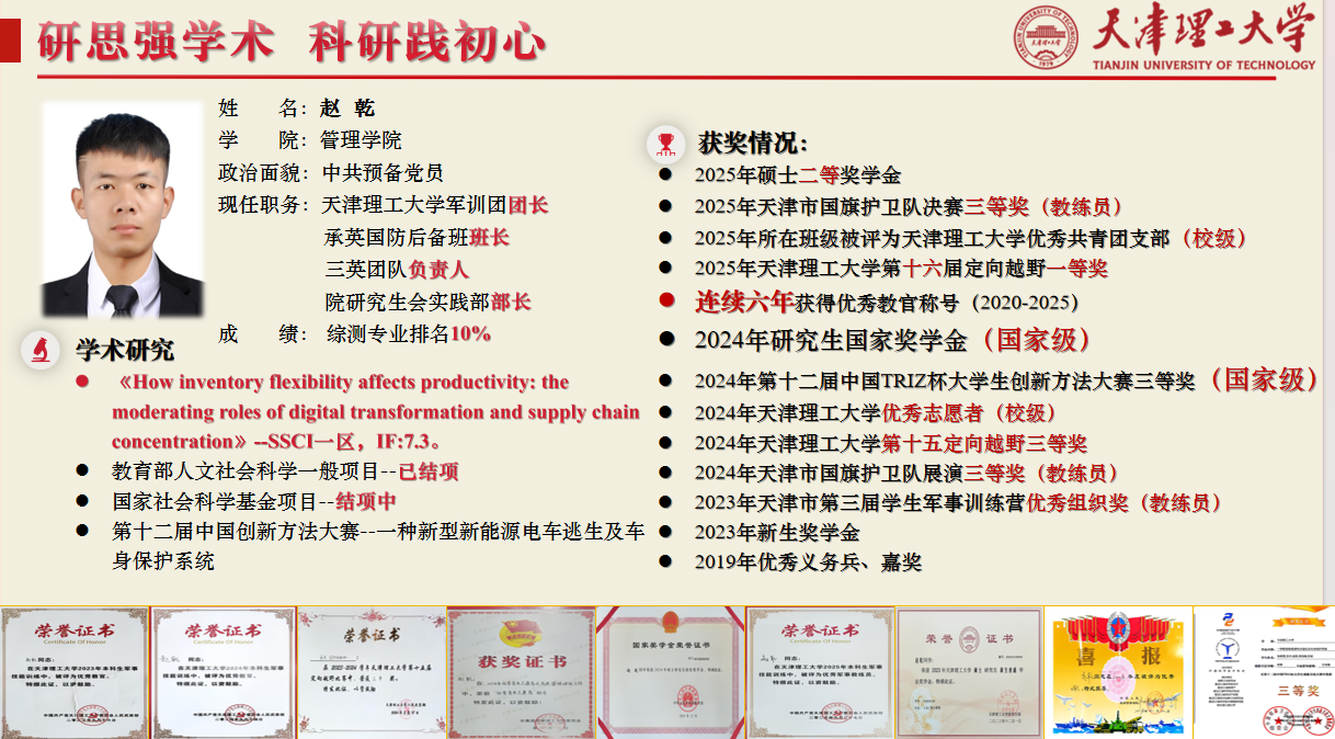 赵乾,男,中共预备党员,管理学院2023级工业工程与管理专业硕士研究生,曾任天津理工大学2025级军训团团长、“三英团队”负责人、院研究生会实践部部长、《大学生军事技能教学法》主讲教师,曾获国家奖学金、天津市优秀学生干部、研究生学业奖学金二等奖、第十二届中国TRIZ杯大学生创新方法大赛三等奖(国家级)、优秀教官、优秀志愿者、优秀义务兵等多项荣誉。